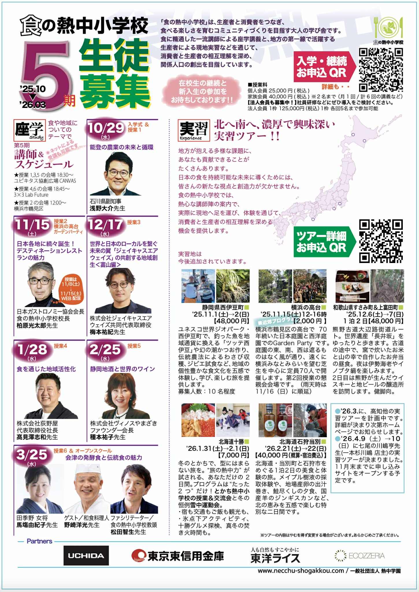 「食の熱中小学校」の情報をお届けする「食熱通信」Vol. 17 を発行しました! ①「諏訪の魅力、食の魅力」金子市長 ② 「長野発酵バレーの魅力と真澄の魅力」 宮坂社長 を掲載しました。 - 第5期生徒募集のチラシが完成しました!