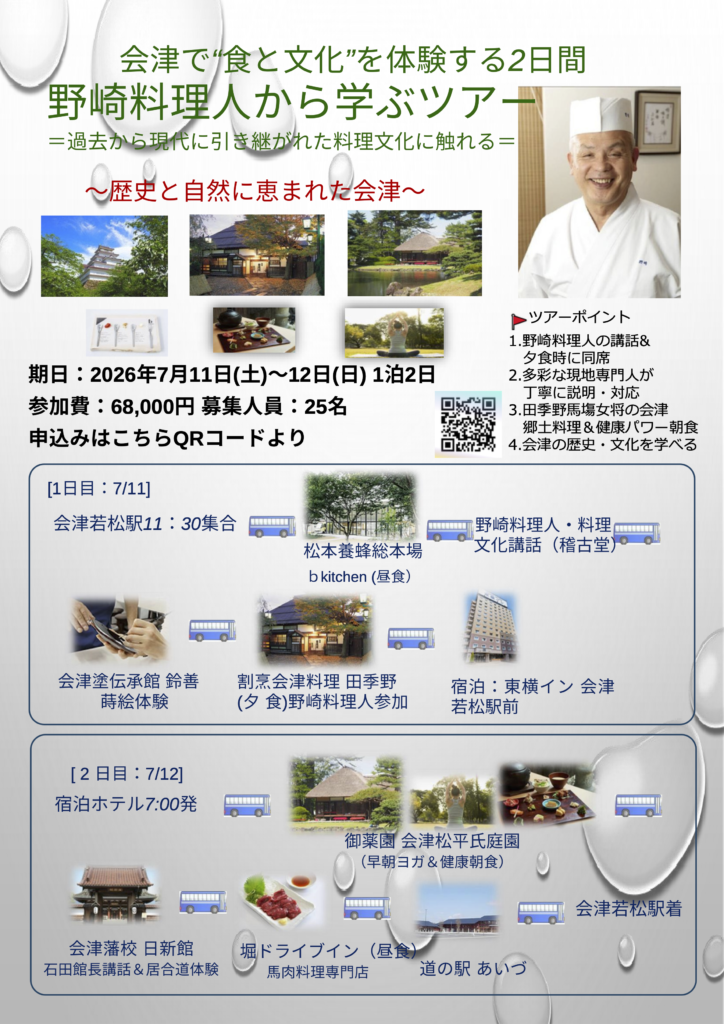2日間のメインは野﨑料理人の会津食文化の講話と田季野での夕食時には同席します。また翌日御薬園でのヨガ・朝食もご一緒する予定です。その他、會津藩校日新館(武士の学校)、蒔絵体験、はちみつテーステング、馬肉料理と会津の文化を堪能できます。