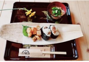 窯で炊いたお米と山の幸でお弁当を自作し、熊野古道から海を眺めながら4キロ半の街道を2時間半かけて歩いて途中で昼食。夜は伊勢海老の鍋料理と、すさみ町が発祥の地である、イノブタ(イノシシと豚の掛け合わせ種)、レタス(栽培発祥地)の鍋の食べ合わせになります。