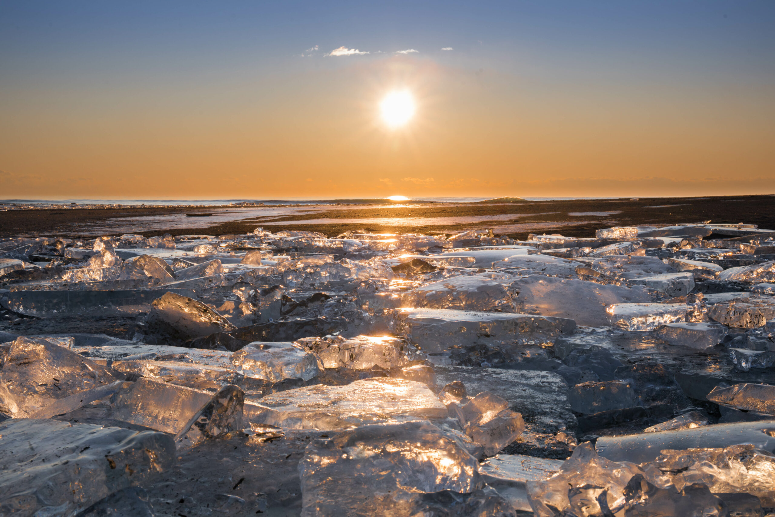 十勝川が運んだ氷が太平洋の波に揉まれて角を取り、朝陽に照らされて宝石のように輝く幻想的な光景。