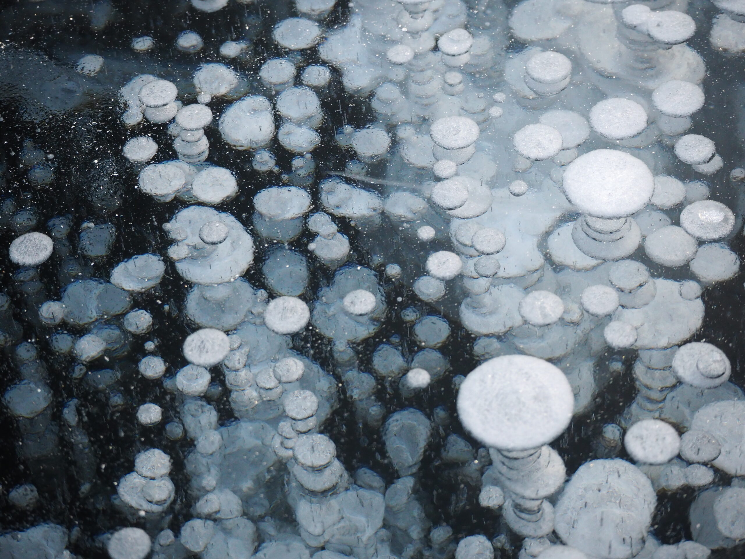 湖底から湧くガスが氷に閉じ込められてできる“泡のアート”。