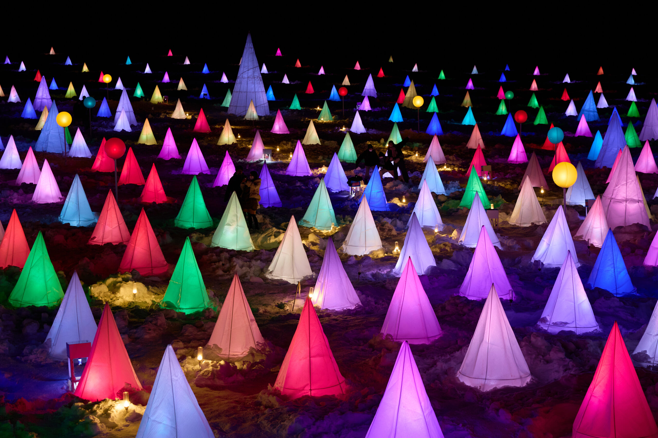 音楽と連動した光の演出が夜の雪原に広がる、冬の一大イベント(1月下旬〜2月中旬頃開催)。