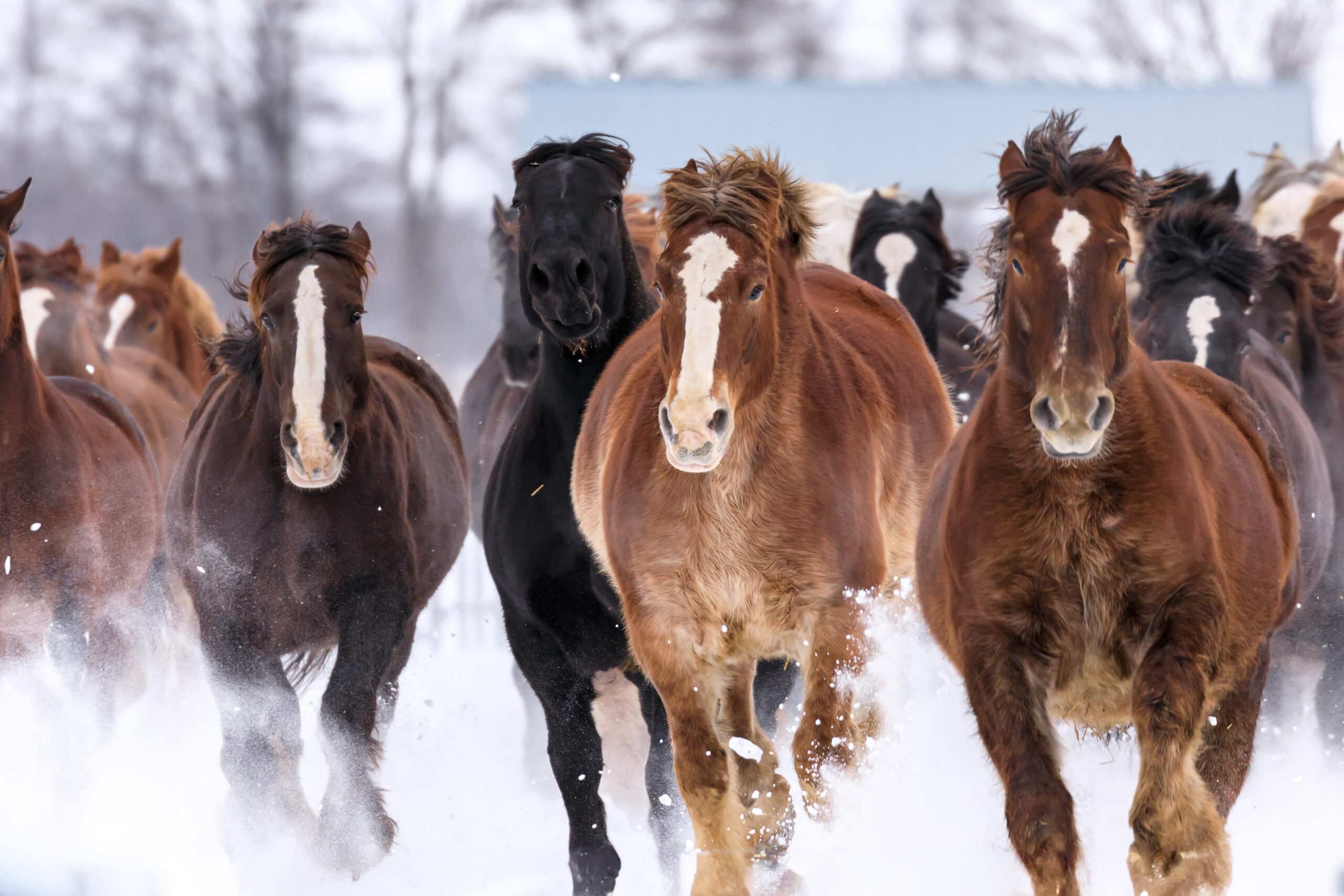 ・1トン超えの妊娠馬たちが雪原を駆ける、冬の風物詩。
