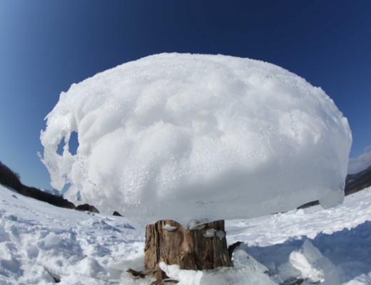 湖底の切り株が、水位の低下と共に氷を載せて現れる“天然の彫刻”。