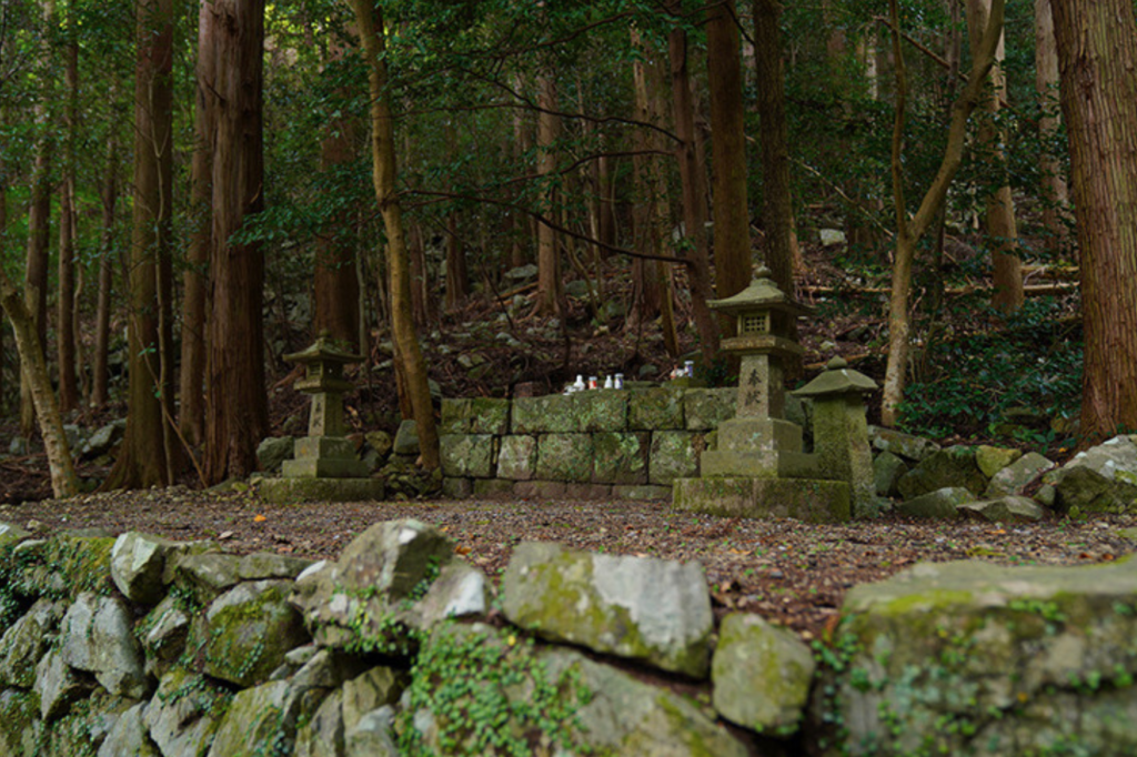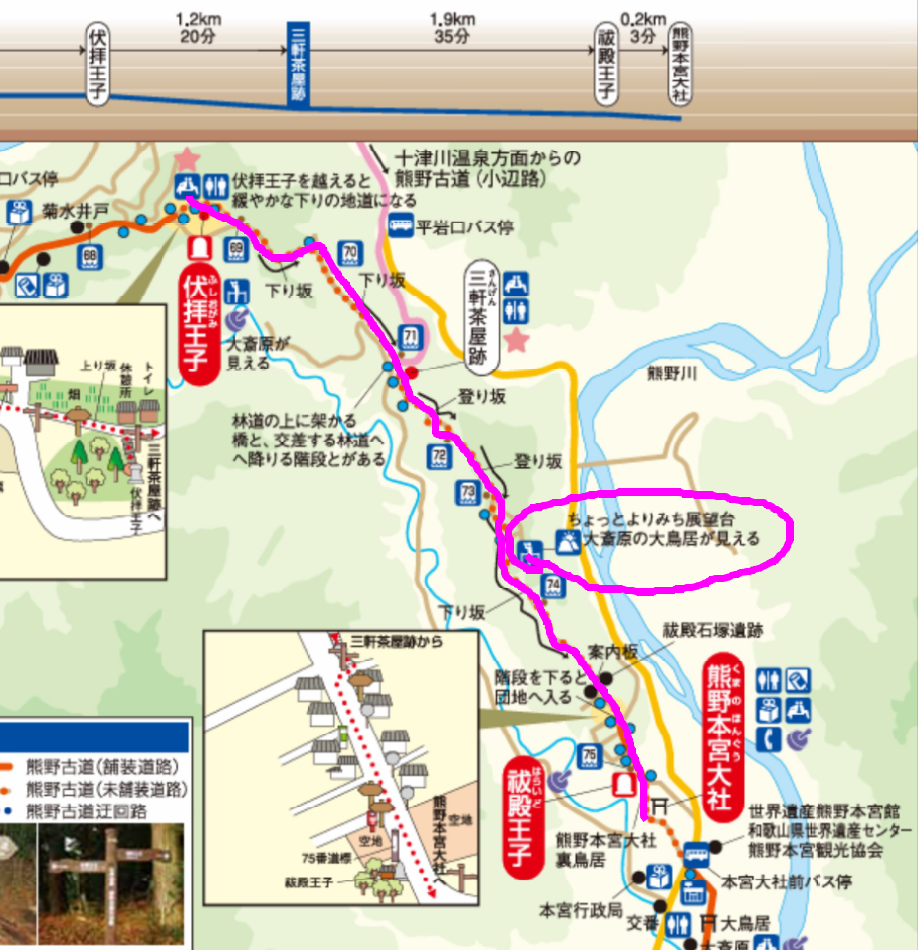 中辺路を歩いてきた参詣者が初めて熊野本宮の森(熊野本宮大社がもともとあった場所)を遠望できた場所で、ここから本宮の森を伏し拝んだことからその名が付きました。また女流歌人の和泉式部が熊野詣でこの付近まで来た時に月の障りとなり、本宮参拝を諦めて本宮の森を伏し拝んで歌を一首詠んだところ、夜に熊野権現が夢に現われ、熊野はそんなことは気にしないのだと返歌し、和泉式部はそのまま参詣することができたといいます。熊野は中央とは異なる価値観を有していることを示すエピソードです。