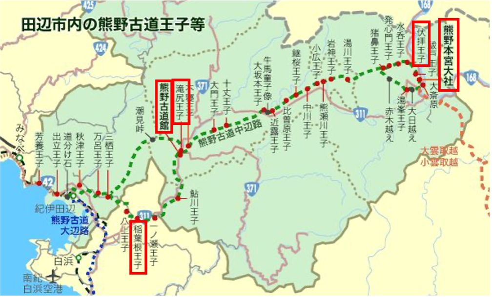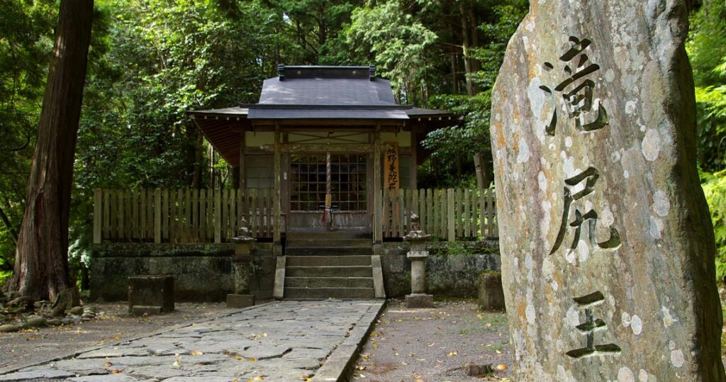 滝尻王子も「五体王子」のひとつで、熊野の霊域の入り口とされたとても重要な場所です。岩田川と石船川の合流点にあり、石船川の急流が岩田川に注ぐ滝のような水音から「滝尻」の名が付きました。