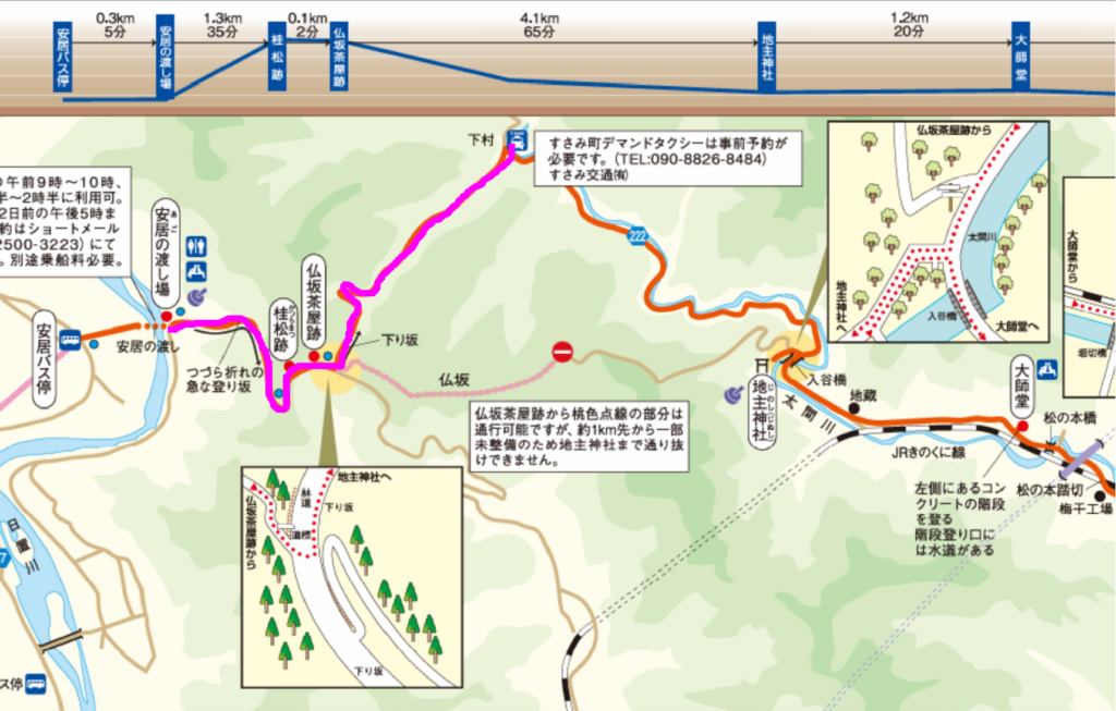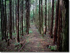 安居の渡しの対岸からすさみに通じる古道で、途中の林道の横断を除き開発の手が入っておらず、古い面影を今に残しています。